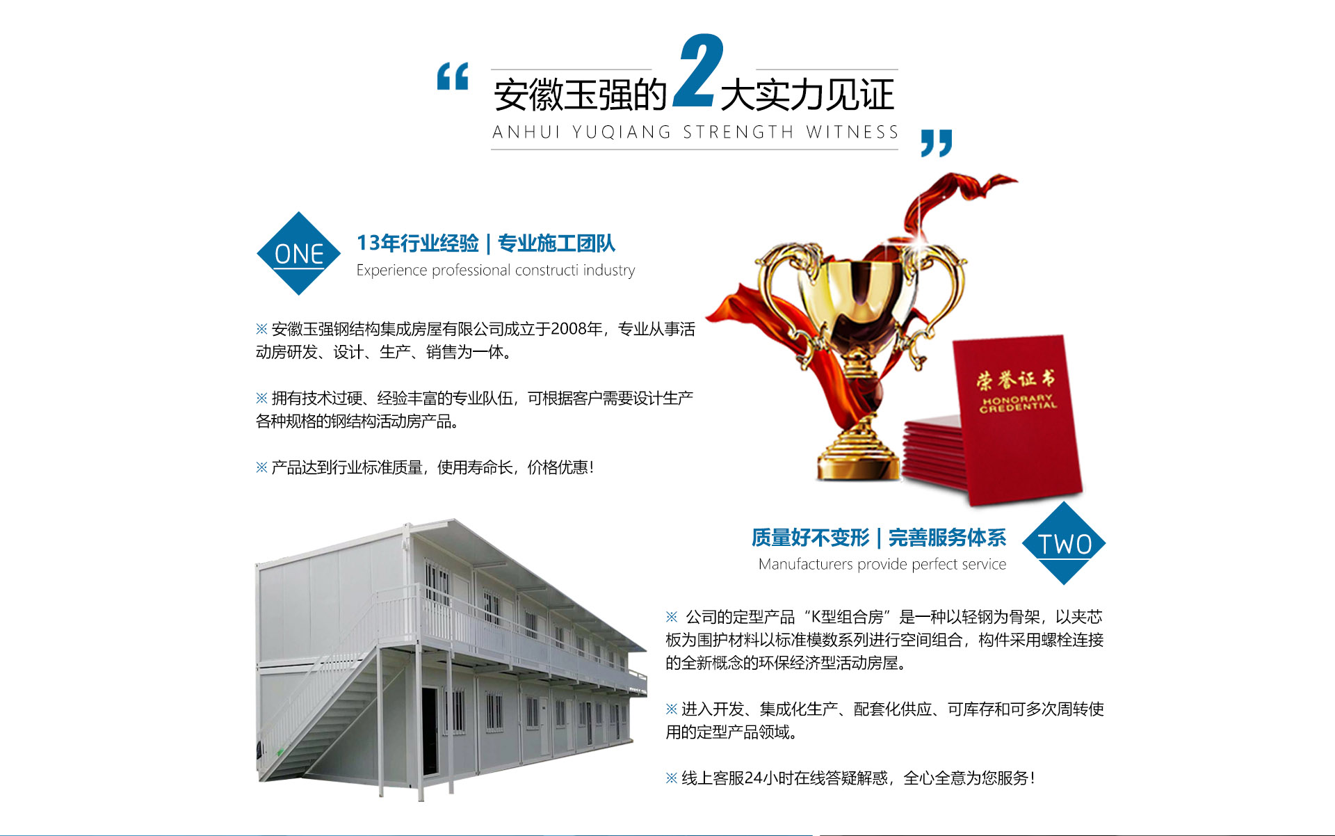 安徽玉強鋼結(jié)構(gòu)集成房屋有限公司是一家集研發(fā)、設(shè)計、生產(chǎn)、銷售服務(wù)于一體的活動房與集裝箱制造企業(yè),公司隊伍具有多年鋼結(jié)構(gòu)制作及產(chǎn)品檢測經(jīng)驗,嚴格按照鋼結(jié)構(gòu)標準要求制作、檢測。致力于提供研、產(chǎn)、銷、于一體,有著多年積累的先進生產(chǎn)技術(shù)和豐富工作經(jīng)驗,采用精良的工藝技術(shù),生產(chǎn)美觀大方的定型產(chǎn)品,長期以來,受廣大用戶的信賴和支持。歡迎您的來電咨詢。